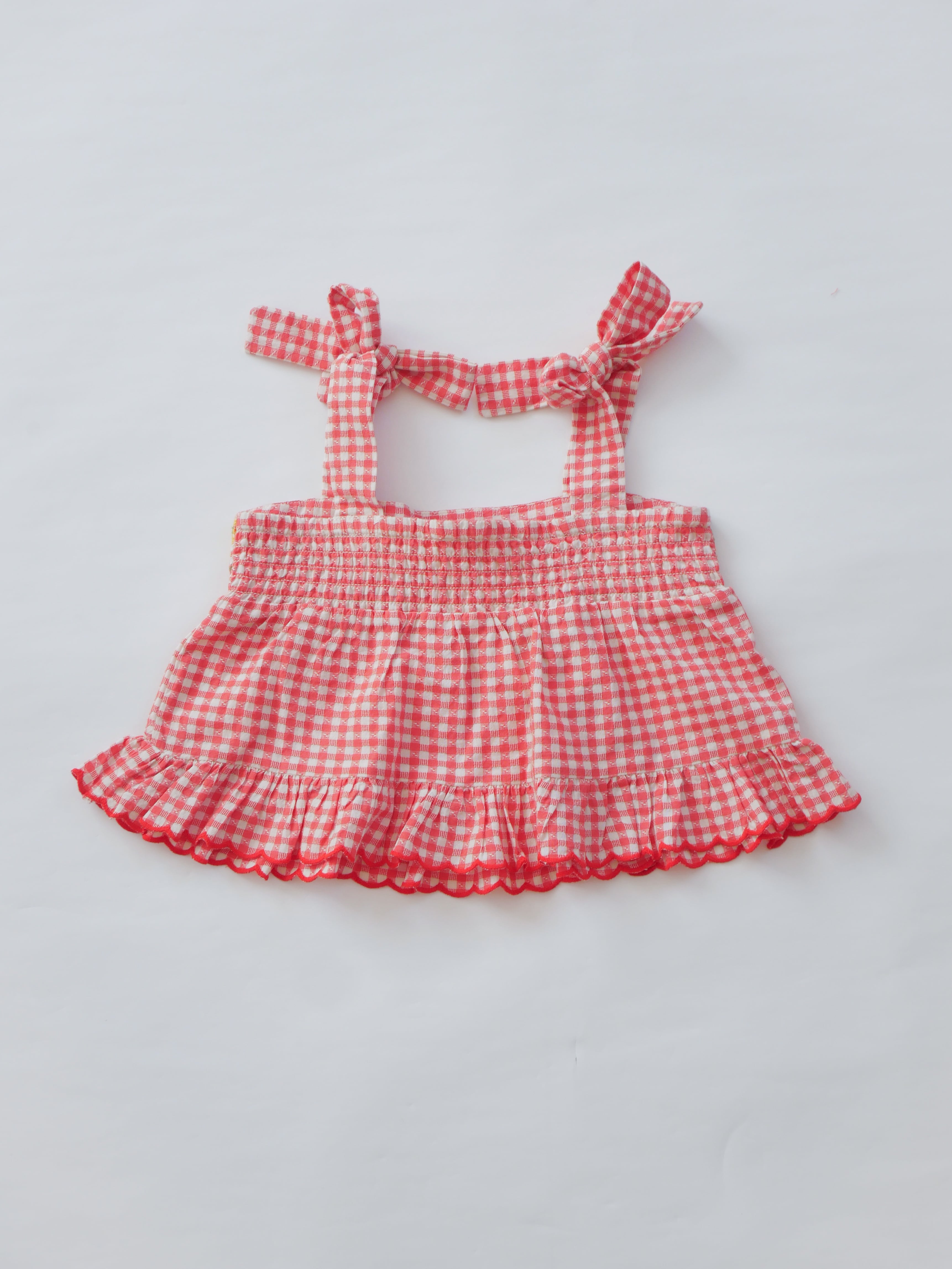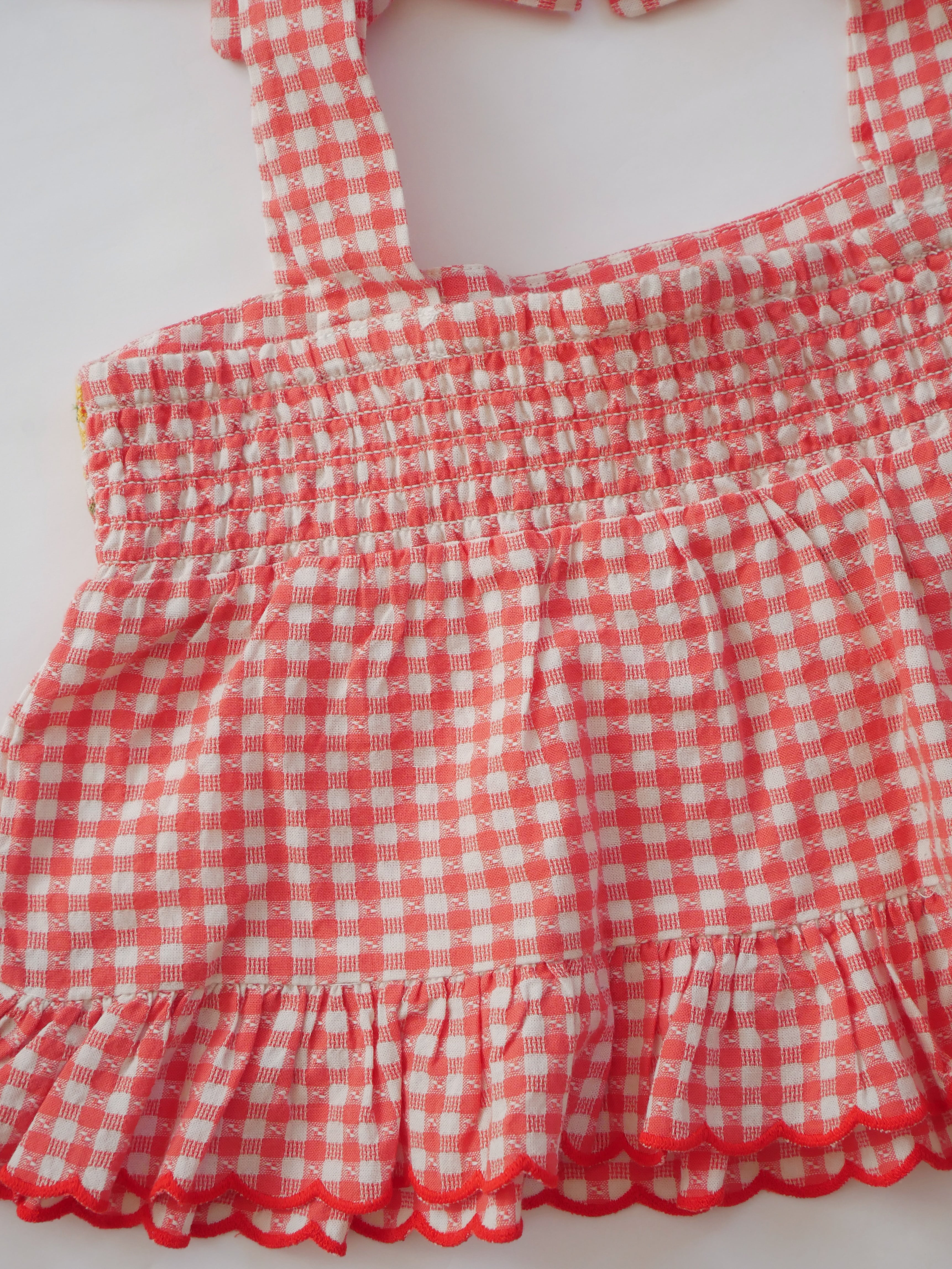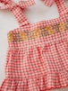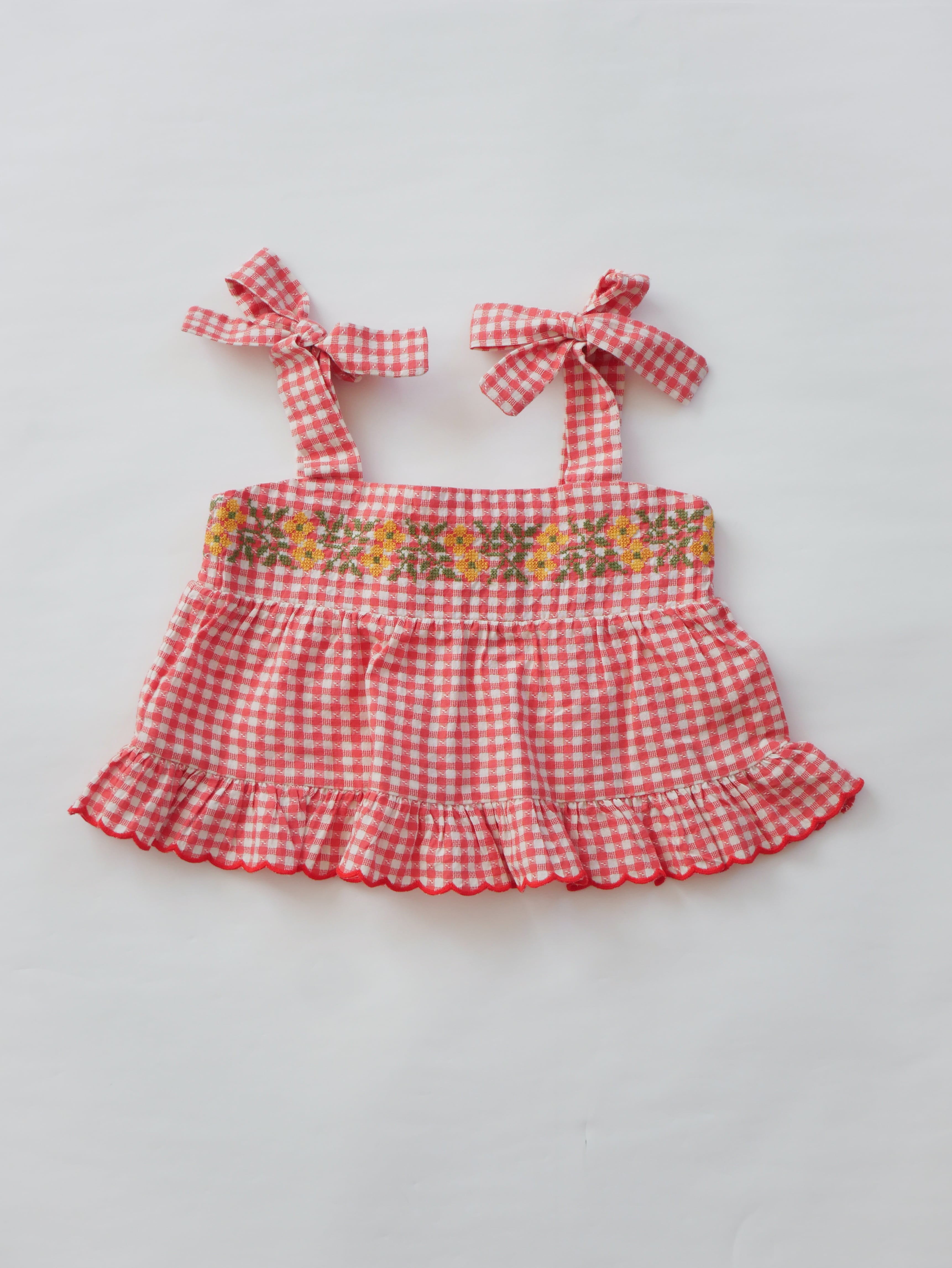 柔らかなレッドカラーのギンガムチェックに、可憐なお花の刺繍が施されたデザインで、